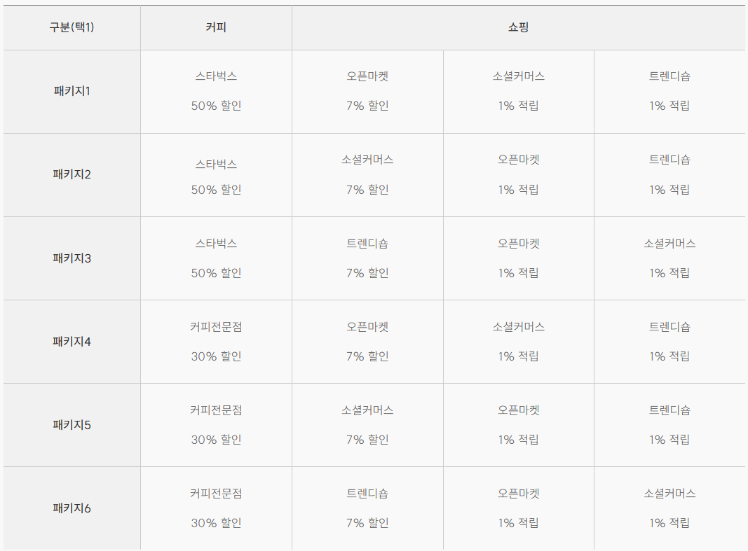 ① 커피 : 스타벅스 50% 할인 또는 커피 30% 할인 중 선택